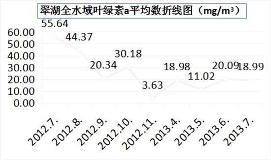 翠湖水域2013年7月26日葉綠素a均值為:18.99mg/m3,?2012年7月23日葉綠素a均值為55.64mg/m3;