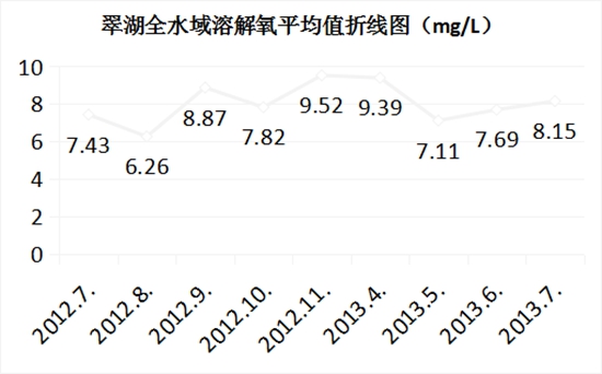 翠湖水域2013年7月高錳酸鹽指數(shù)均值為:4.96mg/L,2012年7月高錳酸鹽指數(shù)均值為:5.4mg/L ,2013年與2012年同期相比,翠湖水域高錳酸鹽指數(shù)下降:8.15%;