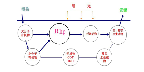 針對目前江河湖泊等開放性水域普遍富營養(yǎng)化和生態(tài)系統(tǒng)失衡導致水質(zhì)污染、藍藻暴發(fā)的環(huán)境問題,以生物工程技術(shù)為基礎(chǔ),結(jié)合包括生態(tài)學、藻類學、流體力學、水產(chǎn)養(yǎng)殖學和自動控制學在內(nèi)的眾多領(lǐng)域的研究成果,以核心技術(shù)產(chǎn)品——RhP微生物制劑消耗水體中呈污染態(tài)的氮、磷、硫、碳等元素,在不耗氧的條件下完成“腐~生轉(zhuǎn)化”,為水生動物營造良好的生存環(huán)境,為浮游生物特別是浮游動物提供生長繁殖條件,為浮游生物食性的水生動物提供豐富的天然餌料,人類通過對這些水生動物的捕撈,將污染物質(zhì)成功轉(zhuǎn)化為可供利用的資源。