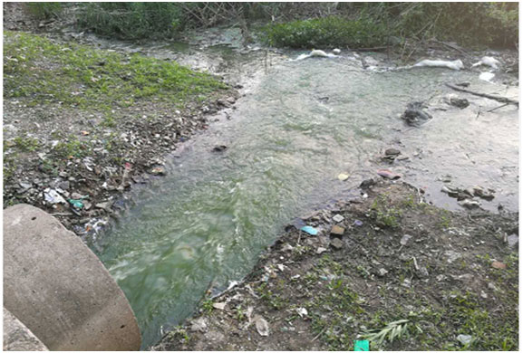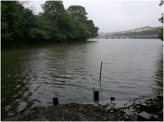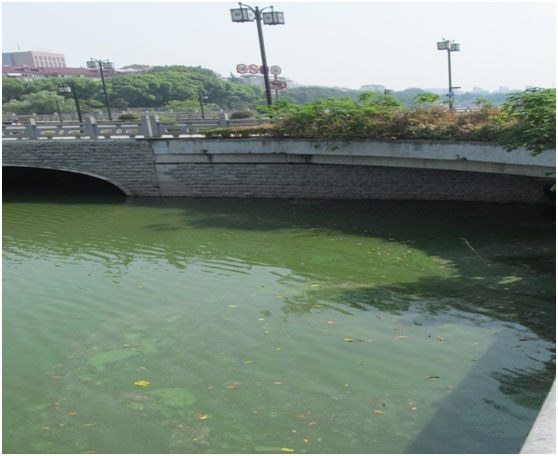 西河入水口,入水中含大量藍(lán)藻(水呈綠色)