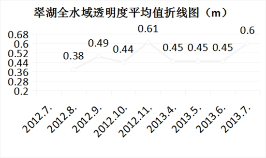 翠湖水域2013年7月透明度均值為0.6m,2012年8月透明度均值為0.38m,2013年與2012年同期相比,翠湖水域透明度提高了57.89%;