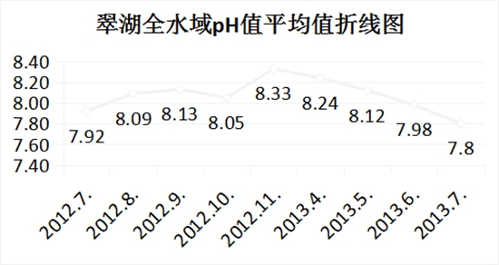 2012年7月至2013年7月翠湖的監(jiān)測(cè)數(shù)據(jù)顯示:各水域水質(zhì)指標(biāo)總氮、總磷、高錳酸鹽指數(shù)、葉綠素a同比均呈波動(dòng)下降,溶解氧、透明度均有所增加,pH值趨于穩(wěn)定。